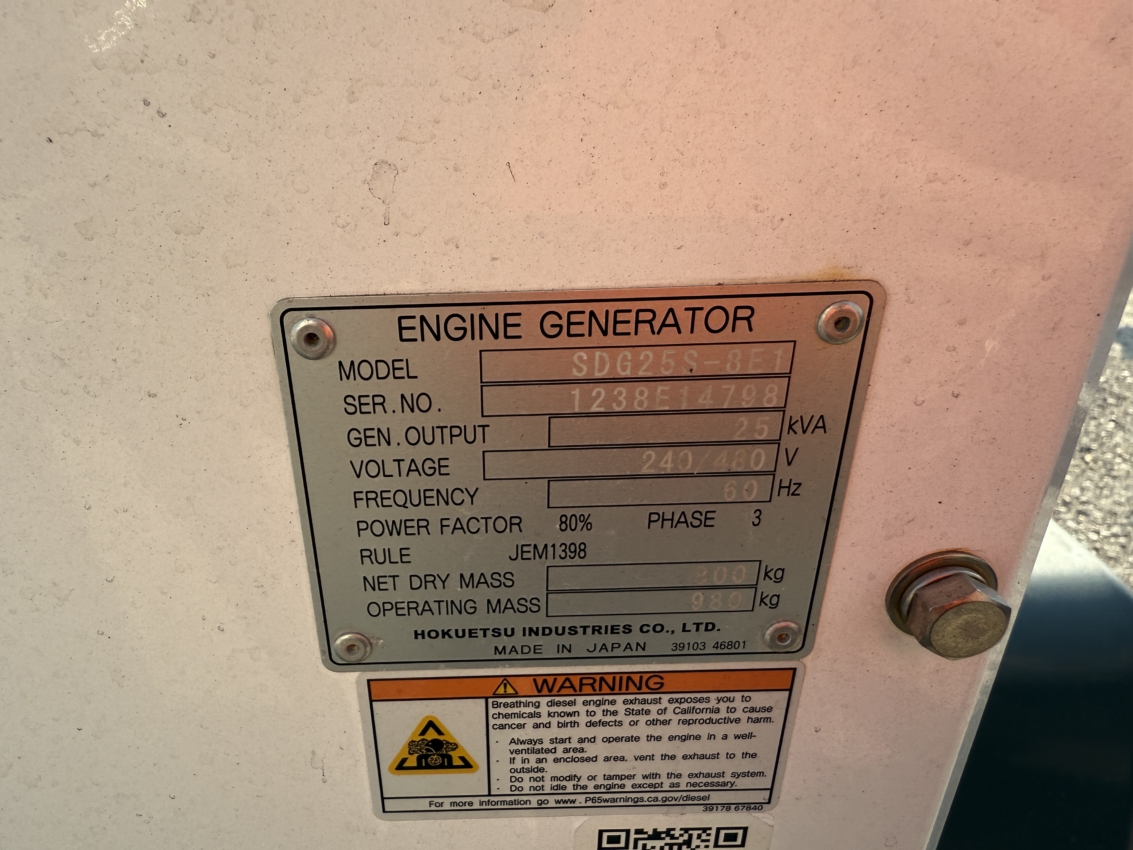 Generator Manufacturer: Hokuetsu Generator S/N: ENGB00A684 kW Rating: 25 kVa Rating: 31 Rating Type: Continuous Voltage: 240/480 Power Factor: 0.80 Frequency: 60 Generator RPM: 1800 Insulation Class: F