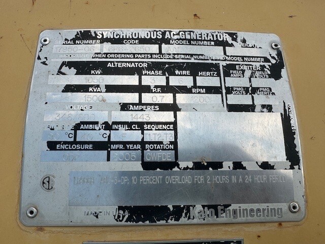 Generator Manufacturer: Kato Generator Model: 6P6-2650 Generator S/N: 17950-06 kW Rating: 1050 kVa Rating: 1500 Rating Type: Continuous Voltage: 600 Power Factor: 0.70 Frequency: 60 Generator RPM: 1200 Temperature Rise: 80 C Insulation Class: F