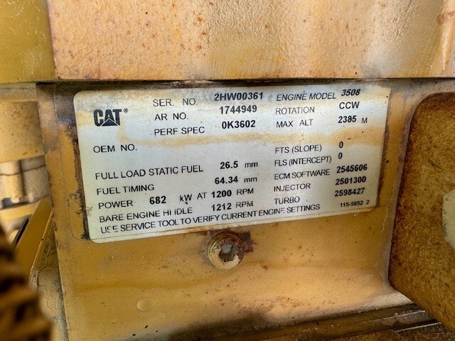 Engine Manufacturer: Caterpillar Engine Model: 3508B Engine S/N: 2HW00361 Engine Arrangement: 1744949 Performance Spec: 0K3602 Engine RPM: 1200 Engine HP: 1000 Governor: Electronic Starter: Electric Cooling Method: Radiator Dual Fuel Capable: ✓