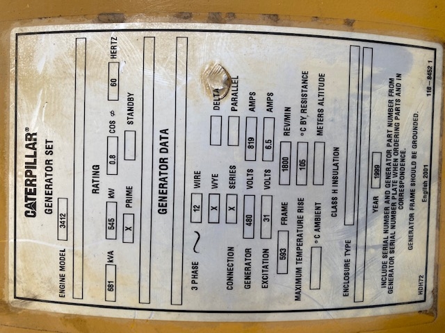 Engine Manufacturer: Caterpillar Engine Model: 3412C Engine S/N: 81Z24791 Engine Arrangement: 7E0160 Test Spec: 2T7568 Performance Spec: DM1910 Engine RPM: 1800 Engine HP: 894 Governor: Woodward PSG Starter: Electric Cooling Method: Radiator Engine Mounted Instrument Panel: ✓ Fuel/Water Separator: ✓ Battery Charger: ✓ Battery Rack: ✓ Battery Cables: ✓ Charging Alternator: ✓ Emergency Stop: ✓