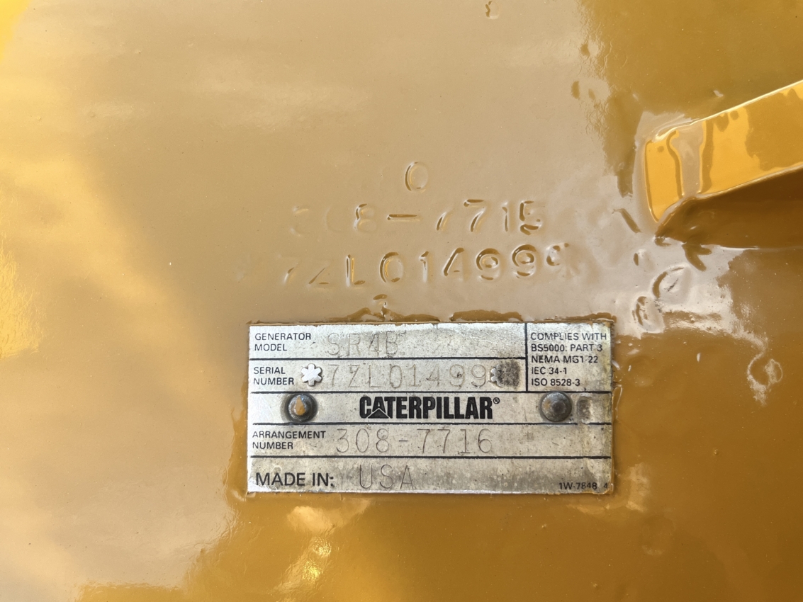 Generator Manufacturer: Caterpillar Generator Model: SR4B Generator S/N: 7ZL01499 Gen End Arrangement #: 308-7716 kW Rating: 455 kVa Rating: 569 Rating Type: Prime Voltage: 277/480 Power Factor: 0.80 Frequency: 60 Leads: 6 Frame Size: 499 Generator RPM: 1800 Bearings: Single Bearing Excitation Type: Self Exited Temperature Rise: 105/40 Windings: Random Wound Insulation Class: H