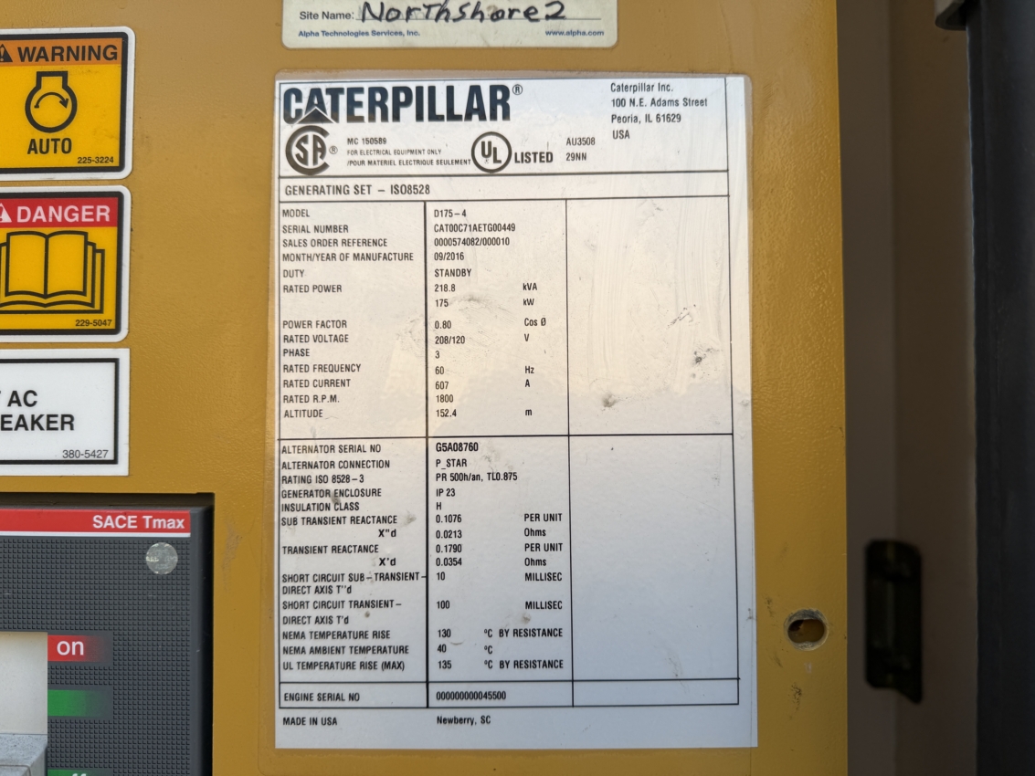 Package Manufacturer: CaterpillarPackage SN: ETG00449Package Model: D174-4Control Panel: EMCP 4.2Circuit Breaker Size: 800Enclosure: Factory EnclosureEnclosure Type: Sound Attenuated EnclosedFuel Tank Option: Base Fuel Tank – Dual WallFuel Tank Size/Gallons: 777Fuel Tank Capacity (Hrs): 72UL 2200 Listed: ✓UL 142 Fuel Tank: ✓