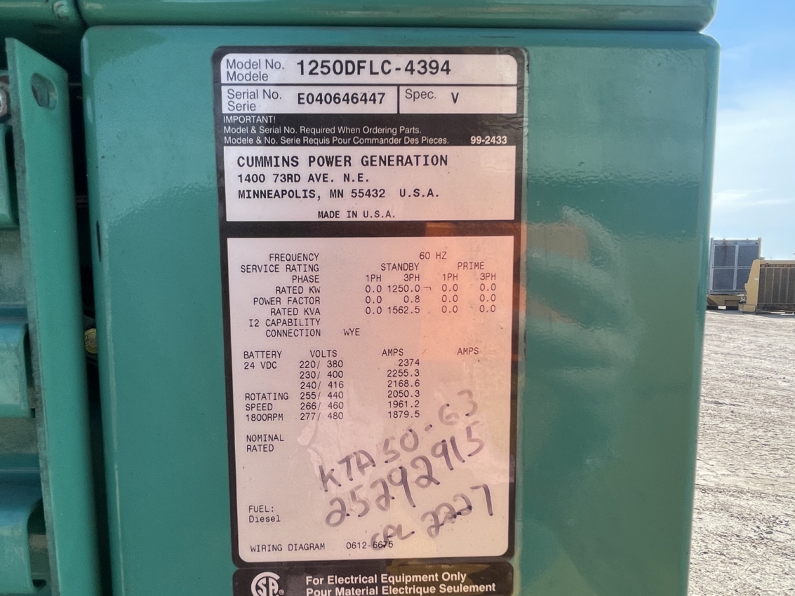 Generator Manufacturer: Cummins Generator Model: 1250DFLC-4394 Generator S/N: E04066447 kW Rating: 1250 kVa Rating: 1563 Rating Type: Standby Voltage: 480v Power Factor: 0.80 Frequency: 60 Generator RPM: 1800 Bearings: Single Bearing