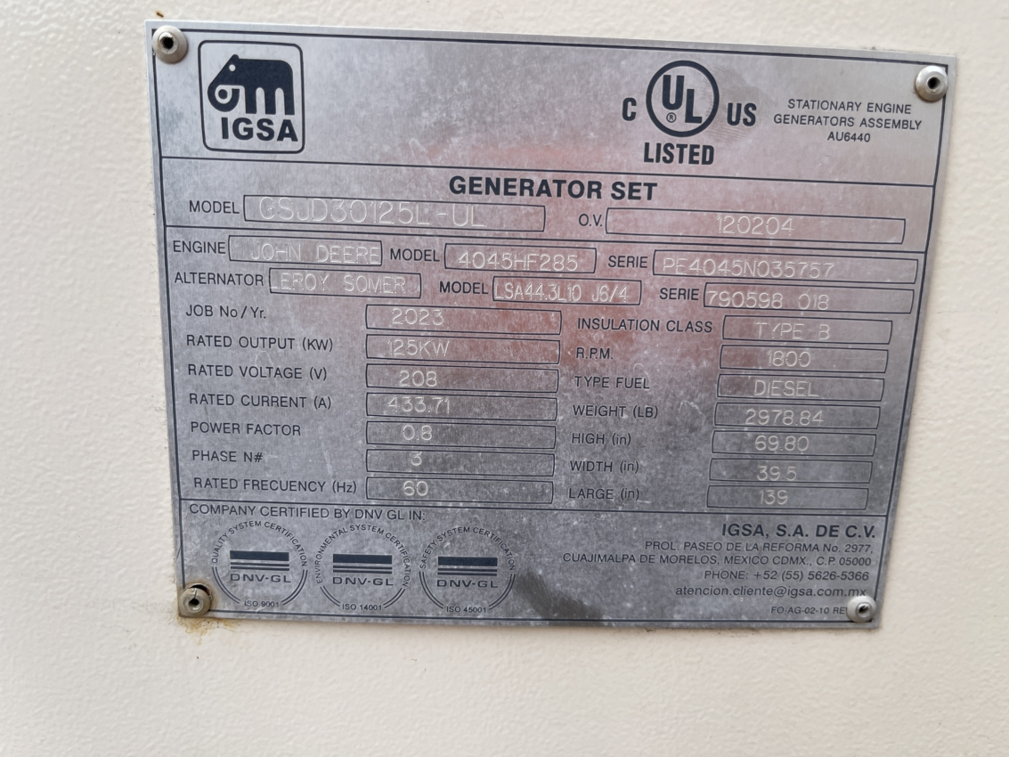 Package Manufacturer: IGSAPackage SN: 120204Package Model: GSJD30125SControl Panel: DSE 7310Enclosure: Factory EnclosureEnclosure Type: Sound Attenuated EnclosedFuel Tank Option: Base Fuel Tank – Dual WallFuel Tank Size/Gallons: 200Fuel Tank Capacity (Hrs): 24