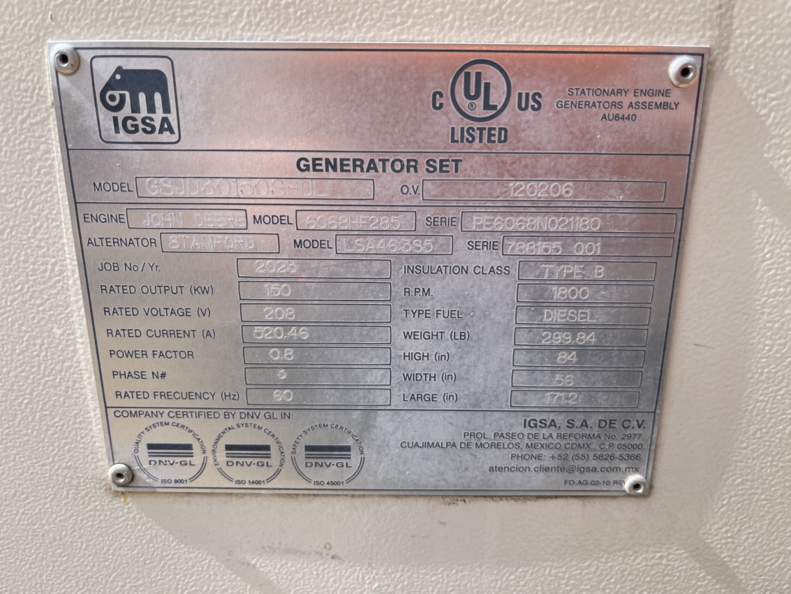 Package Manufacturer: IGSAPackage SN: 120206Package Model: GSJD30150SControl Panel: DSE 7310Enclosure: Factory EnclosureEnclosure Type: Sound Attenuated EnclosedFuel Tank Option: Base Fuel Tank – Dual WallFuel Tank Size/Gallons: 300Fuel Tank Capacity (Hrs): 24