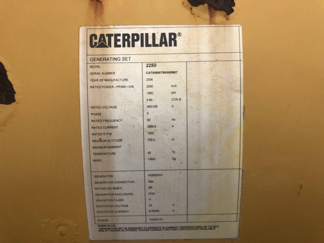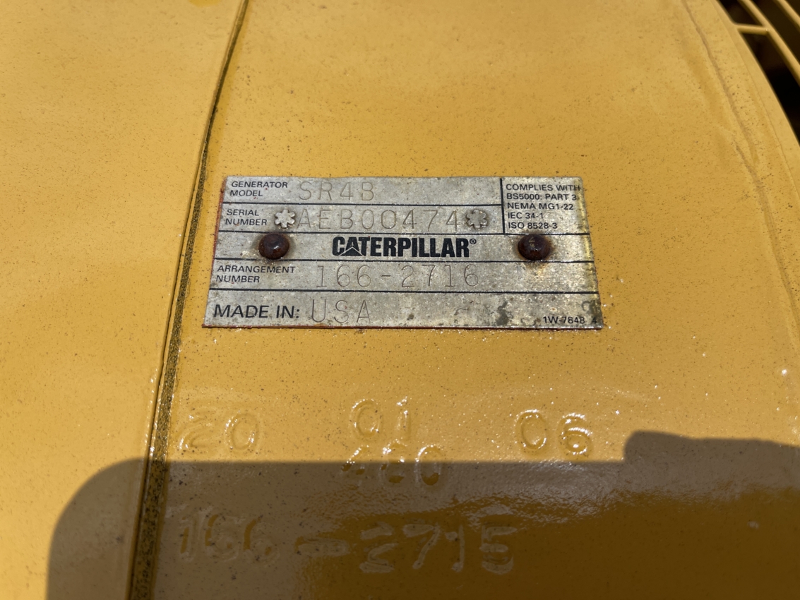 Generator Manufacturer: Caterpillar Generator Model: SR4B Generator S/N: AEB00474 Gen End Arrangement #: 166-2716 kW Rating: 2000 kVa Rating: 2500 Rating Type: Standby Voltage: 480 Power Factor: 0.80 Frequency: 60 Leads: 6 Frame Size: 826 Generator RPM: 1800 Bearings: Double Bearing Excitation Type: Permanent Magnet Excitation Temperature Rise: 80 Deg C Windings: Form Wound Insulation Class: H