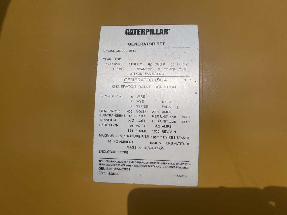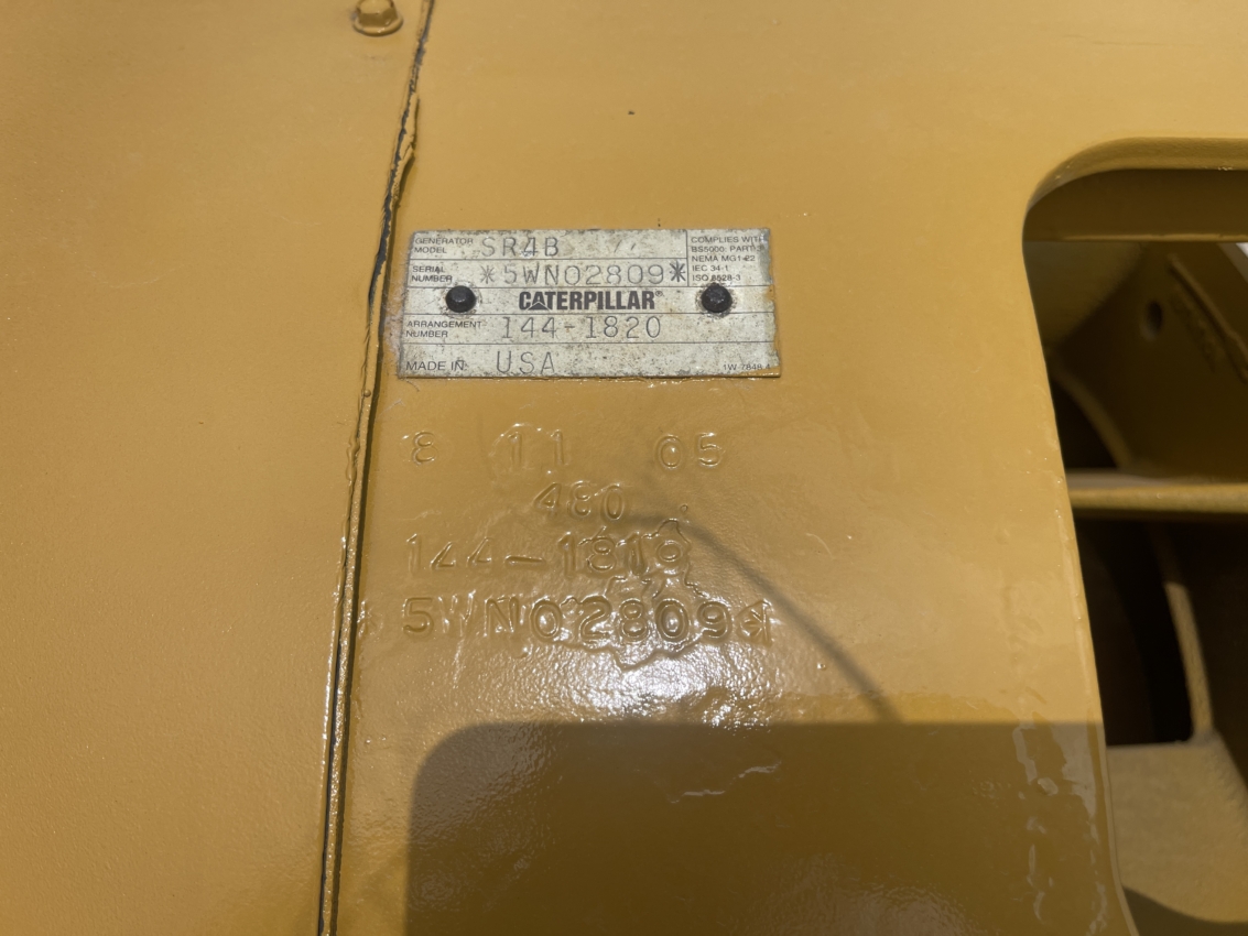 Generator Manufacturer: Caterpillar Generator Model: SR4B Generator S/N: 5WN02809 Gen End Arrangement #: 144-1820 kW Rating: 1360 kVa Rating: 1700 Rating Type: Continuous Voltage: 400 Power Factor: 0.80 Frequency: 60 Leads: 6 Frame Size: 824 Generator RPM: 1500 Bearings: Single Bearing Excitation Type: Permanent Magnet Excitation Windings: Form Wound Insulation Class: F
