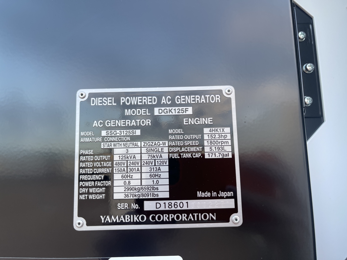 Generator Manufacturer: YAMABIKO CORPORATION Generator Model: SSG-3125SI Generator S/N: 125-0311 kW Rating: 100 kVa Rating: 125 Rating Type: Prime Voltage: Multiple Power Factor: 0.80 Frequency: 60 Leads: 12 Generator RPM: 1800 Bearings: Single Bearing