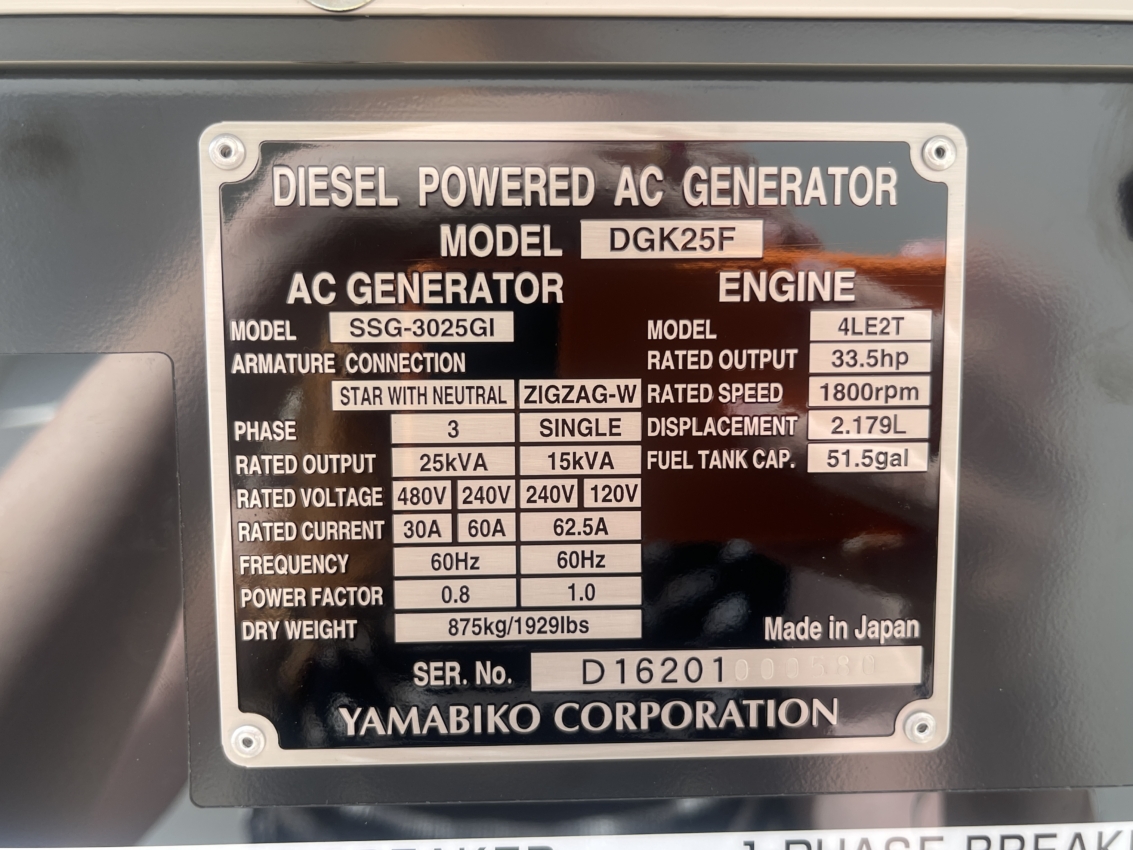 Generator Manufacturer: YAMABIKO Generator Model: SSG+3025GI kW Rating: 20 kVa Rating: 25 Rating Type: Prime Voltage: Multiple Power Factor: 0.80 Frequency: 60 Leads: 12 Generator RPM: 1800 Bearings: Single Bearing